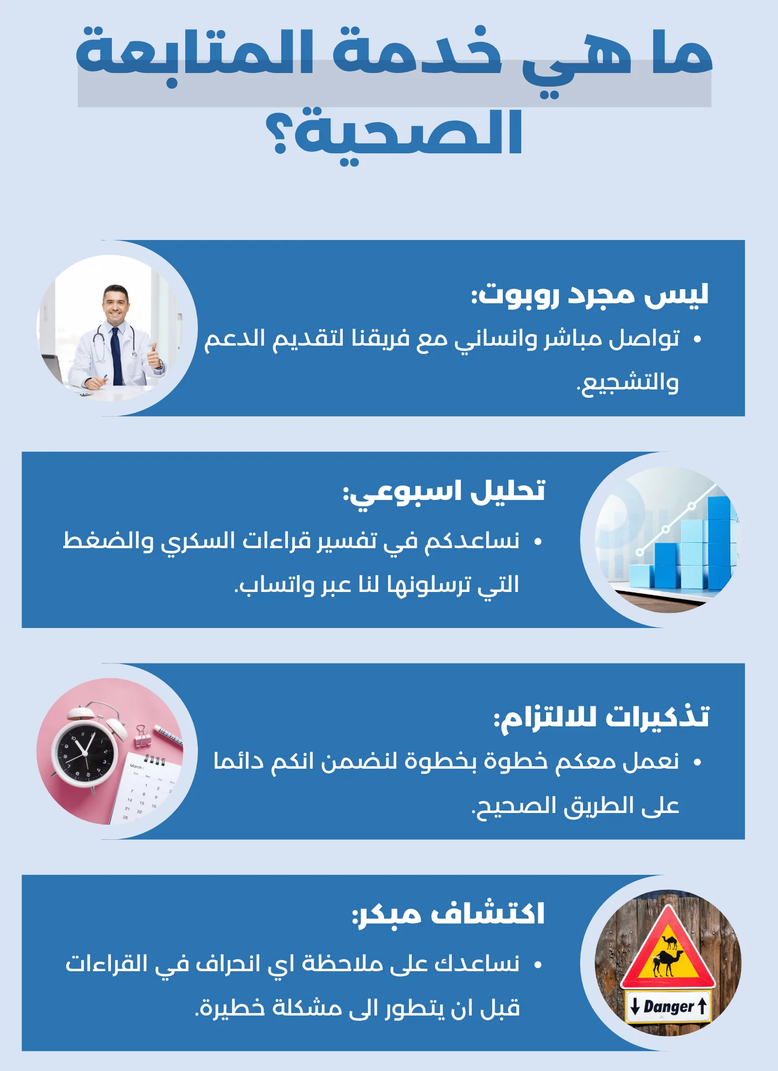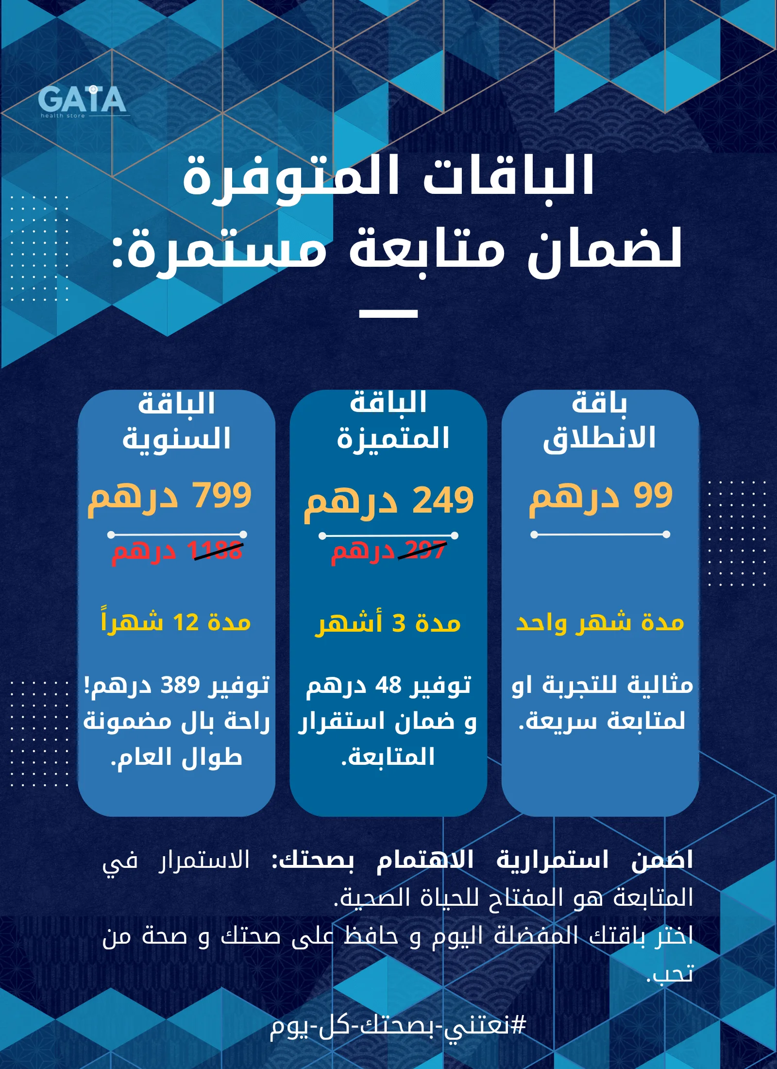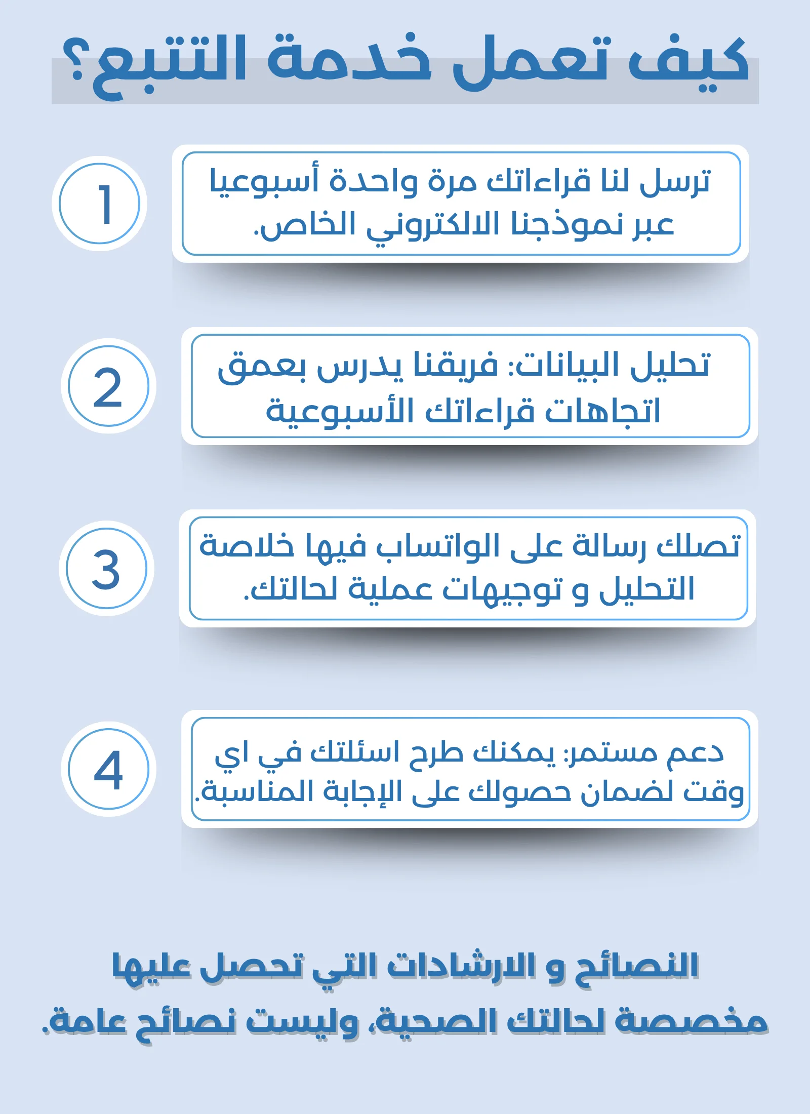 بعد كل شراء لاجهزتنا، ستحصل على اشتراك مجاني في خدمة "التتبع الصحي" لمدة شهر عبر تطبيق الواتساب مقدمة من طرف اخصائيين في المجال.